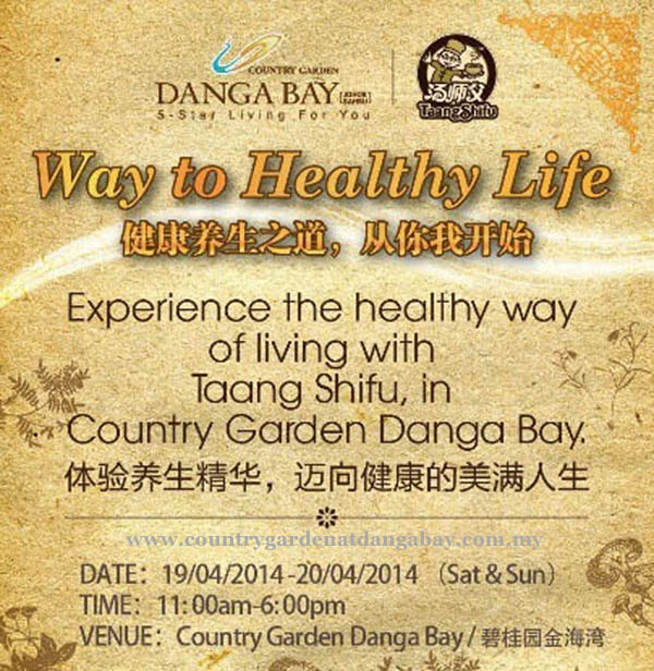 Great news! Country Garden Danga Bay corporates with Taang Shifu to organize "Way to Healthy Life" event at this Saturday and Sunday (19th & 20th April 2014). It is located at 2nd Commercial Street which is beside CG@DB Sales Gallery.
